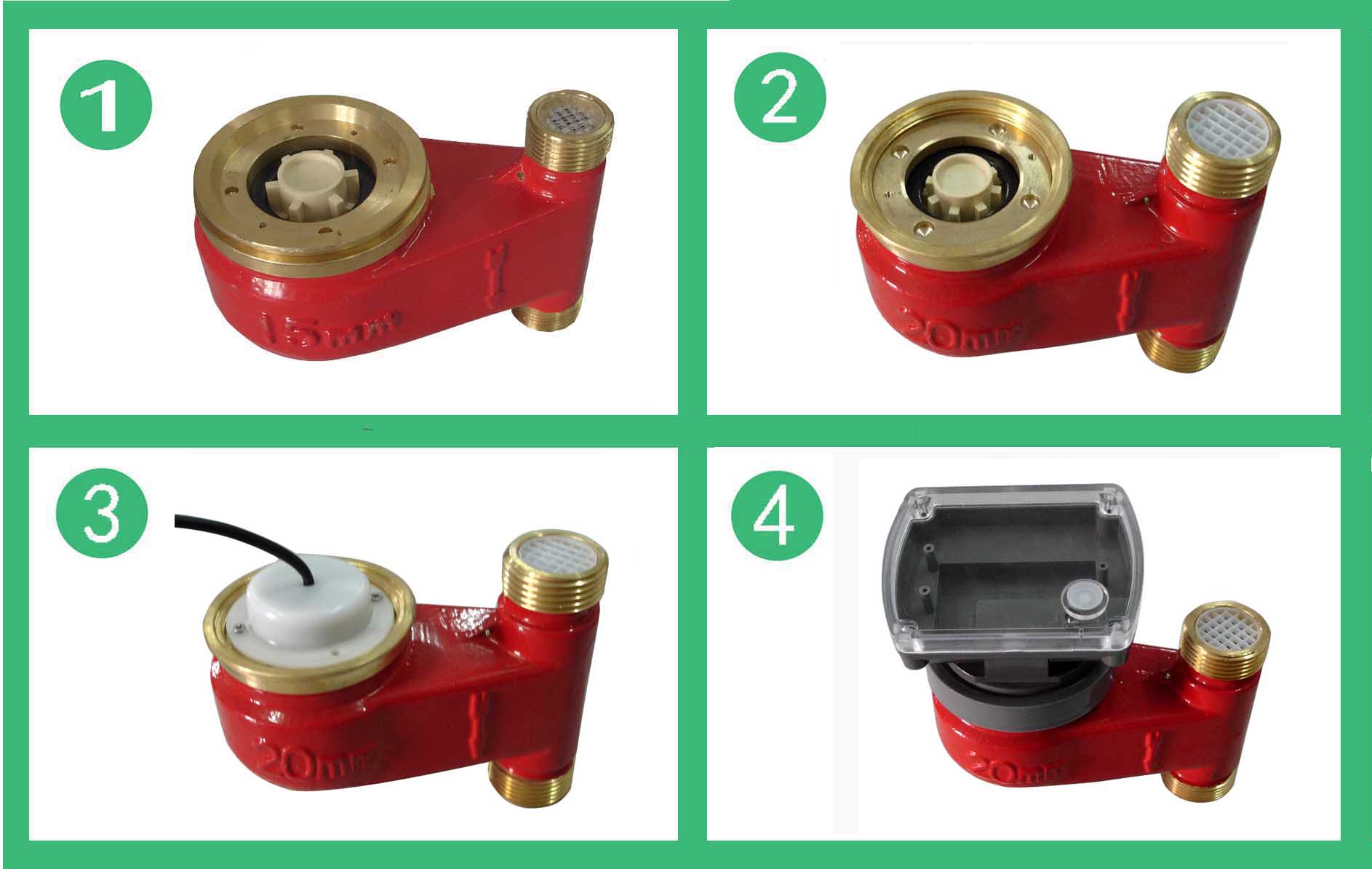 DS97TAR多流束有磁熱量表流量計(jì)的結(jié)構(gòu)如圖,其工作原理是:熱水進(jìn)入流量計(jì),經(jīng)進(jìn)水導(dǎo)向孔沖擊計(jì)量腔內(nèi)的葉輪旋轉(zhuǎn),再經(jīng)出水導(dǎo)向孔流出流量計(jì)。葉輪上面嵌有磁鋼隨葉輪旋轉(zhuǎn),在隔板上端的韋根遠(yuǎn)傳組件,接受葉輪旋轉(zhuǎn)的周期信號(hào)。其殼體采用優(yōu)質(zhì)黃銅,經(jīng)鑄造、數(shù)控機(jī)床和組合機(jī)床加工,機(jī)械強(qiáng)度好、尺寸精度穩(wěn)定一致,塑料零件選用進(jìn)口的高強(qiáng)度耐熱工程塑料,密封件采用優(yōu)質(zhì)耐熱材料。因此,該流量計(jì)完全能夠適應(yīng)國內(nèi)供熱系統(tǒng)的惡劣工作環(huán)境。