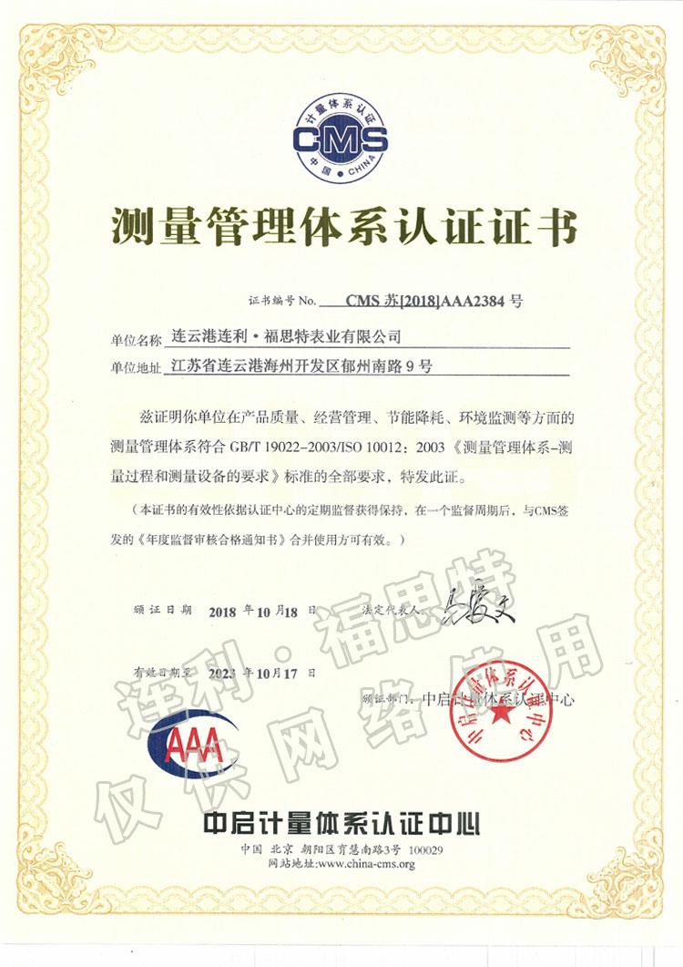 測(cè)量管理體系認(rèn)證證書